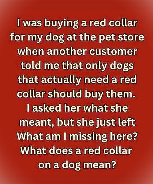 I was buying a red collar for my dog when a stranger leaned over and said only dogs that really need red collars should wear them. Before I could ask what she meant, she walked away. I stood there confused and embarrassed, her words echoing in my head.